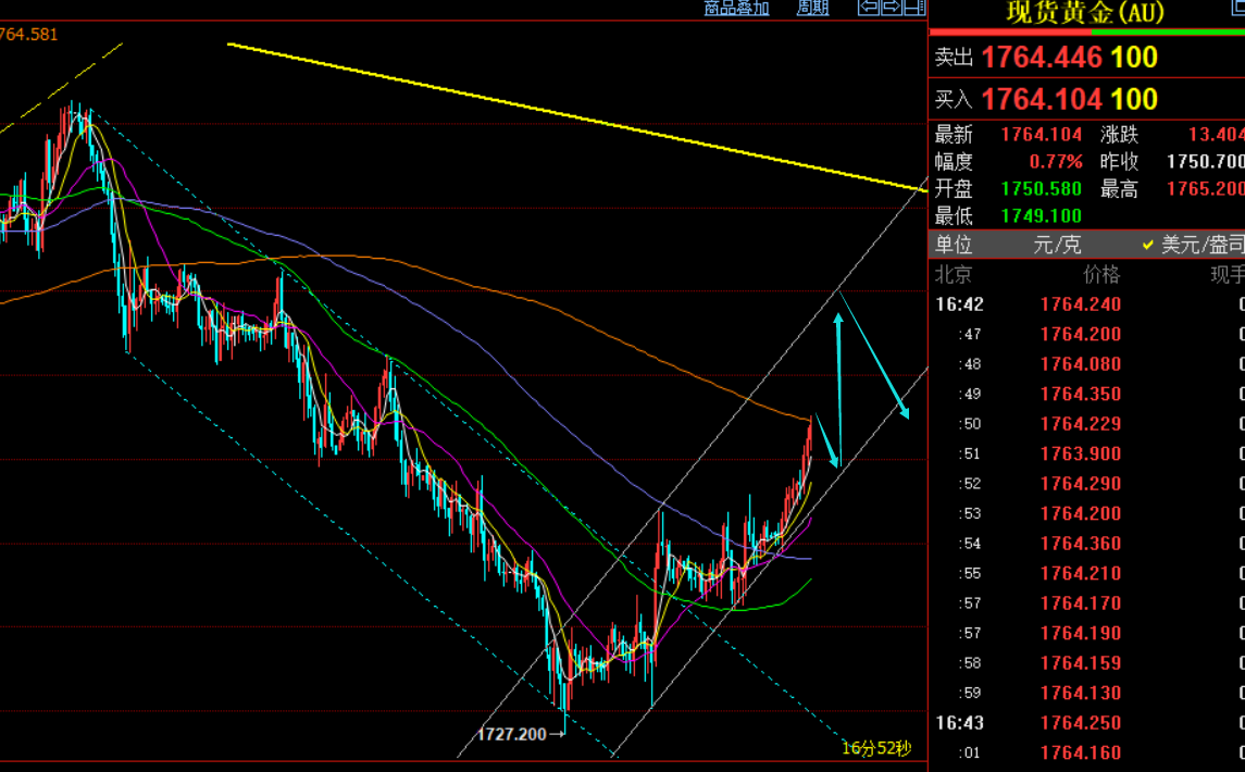第三,黄金小时线级别:早盘依托凌晨横盘支撑1748上,直接连阳慢走高,午后延续拉升,即将试探年均线1765阻力;当出现几乎都是阳K线情况下,表面反弹势头还是偏强,不宜空,出现回测还是继续布局多为主,短期上行通道下轨支撑上移至1754-55,此位置上继续保持反弹格局;而按照上轨衍生阻力推演来看,是指向1777-1780,这里的压制会较强,也适合反手空布局为主试探;