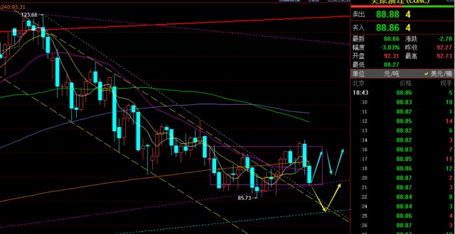 原油操作思路上:88-88.3支撑有,短多激进些试探,失守88下行则要反弹调仓出局; 今晚拉升91下可空一次,看二次下跌,届时回落关注日内低点得失情况;