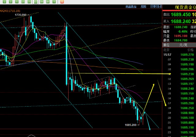 第一,黄金方面:周二隔夜大幅下挫,昨日则依托凌晨高点1709下继续看空,刚好也是382分割阻力承压点;而日内亚欧盘始终无力反抽,维持窄幅慢上行震荡,一般大跌后处于低位运行不上,则容易续跌,因此提前安排1705下做空,一直到凌晨2点连阴失守1700下破小型通道支撑,走了一波续跌至1693一线;