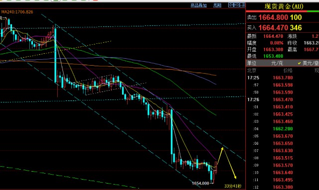 第三,黄金小时线级别:隔夜大幅下挫,今日亚盘压制凌晨高点1669下直接横盘走弱再次破底,欧盘触及1654一线有所探底拉升,这是因为macd底背离所产生的修正;那么此时不急于布局,短期下跌通道下移至1672-73,刚好也是大阴砸盘后首次反弹的高点,预计底部会反复震荡下,目的就是时间换指标的多空转换,从而达到空间上的效果;