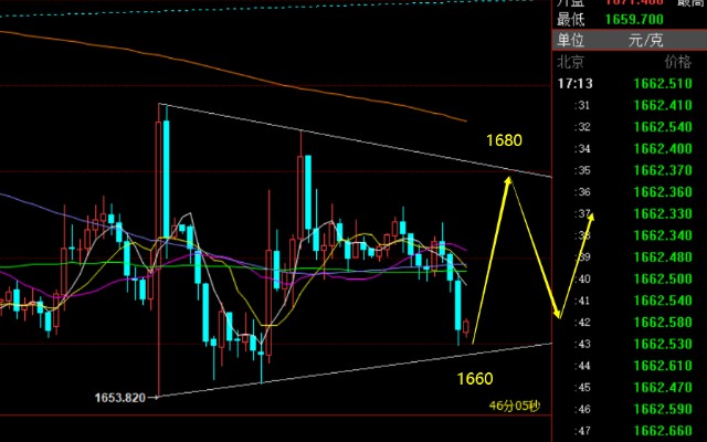 第三,黄金小时线级别:当前要关注的是一个缩口三角通道内整理,上轨1680一线,下轨1660-59一线,在区间未有效破位失守前,暂时只能继续围绕通道内高抛低吸运行;
