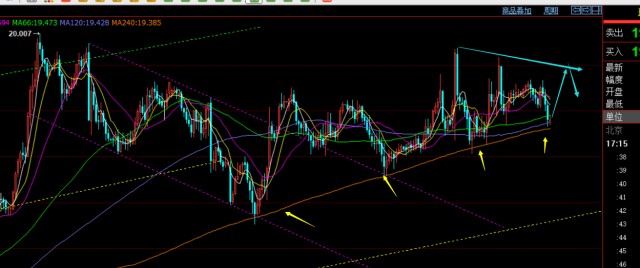 白银方面:同样也是震荡,小时线一直依托年均线上运行,高点也逐步下移,它也是三角缩口整理,看后面的突破情况;在未失守前,也先按震荡继续整理,支撑19.38一线,阻力19.75,区间不大;