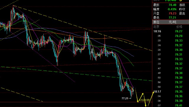 原油方面:上周五也是大阴破位下行,有效失守81-83区域震荡支撑,周五美盘也是视频中,明确给出依托顶底位置81.2一线直接去跟空,今日最终快逼近77提及的目标;同样的,日线和周线大阴破位趋势通道支撑后,也有几日的低位弱势运行时间,周初反弹空继续跟随;早间触及80一线承压,一路连跌下滑,而80刚好也是确认通道跌破口位置,那么当出现连阴形态后,结合macd背离,容易步入震荡,依托618分割阻力依然可以再尝试空;