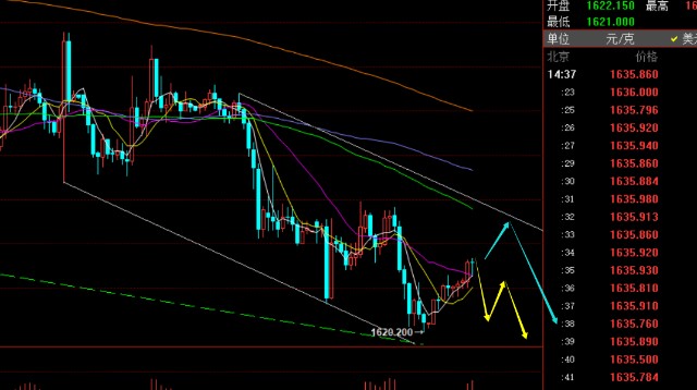 黄金思路上:1637下继续看压制下行,目标1625-26、1620、1613; 若突破1637继续上行,则晚间1650下压制还是会计划高空;