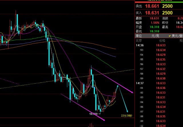 第二,白银方面:昨日提及短期压力18.8一线,承压看下行,风水岭19.7,此位置不上破,短期价格会保持走弱下行,最低触及18.3一线;