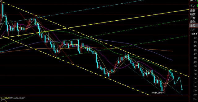 第四,黄金小时线级别:隔夜下跌,收盘于1693低位,今日开盘小幅冲至1700就立刻承压回落,盘中通知学员1702上继续空,给不到入场机会;随后一路连跌慢下行,这种走势属于阴跌,一旦高位踏空,就很难再上车;一路弱势不反弹,又不太想直接追空,不属于稳健风格;当前阻力10均线1691一线,以及中轨1696一线,都是承压短空参考位置,支撑1680上,再往下就是1672-71、1658-59,一个是多次顶底转换点,其他两个属于分割支撑点;