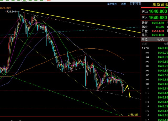 第三,黄金小时线级别:今日早盘触及通道上轨,出现承压迹象后,果断1652通知继续空,震荡慢下行压制,欧盘来了短暂的大阴小加速破底,最低1636,成功于1640预期目标拿下;那么欧盘一路下跌后,美盘前后一旦出现反弹则判断为诱多,就是再次做空的时机,阻力点参考618分割阻力1648一线,通道上轨阻力有所下移至1650一线,因此1650下逢高可以接着空;有些朋友若激进想参与短多博反弹的,建议可以关注1633-34处,或存在一定趋势衍生支撑(1642、1640两点连线);这里若守不住,则要试探1622-20一线,甚至前低1614;