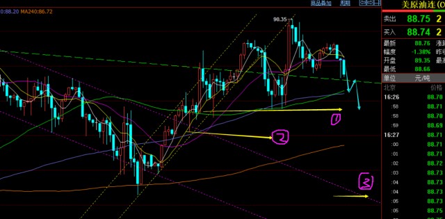 白银方面:当前反复失守小时线年均线19.28,今日重点关注此处,两三次无力再回归此线上方,意味着将正式破位,下方就可指向18.45一线;19.45早盘高点当前也可以作为一定风水岭,欧盘始终压制19.28下,则考虑弱势延续跟空;当前处于箱体通道下轨19.1位置,暂不好直接追空,除非此下轨大阴继续破位,则只能极弱空;