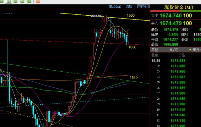 第二,黄金4小时级别:隔夜连阳强力拉升,今日早盘低开后回补缺口再下行,顶部收报一根长上影受压形态,则有一定的下跌修正,第一支撑1667-66一线已经试探到位,也靠近年均线位置;关注欧盘走势,若继续下破,则有望指向10日1660下,以及中轨和66日重合点1650-48一线;反之,再拉升回去,则留意1680一线得失;