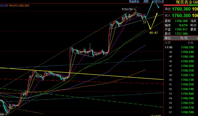 黄金思路上:留意1757和1770两个位置得失,上下有效突破后都会有一波延续,往上是看1788,往下是看1740-42;