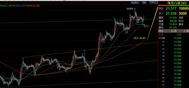 第二,白银方面:20.85一线有效突破站上后,刺破21.7日线年均线冲击22一线,它的力度倒开始小于黄金;