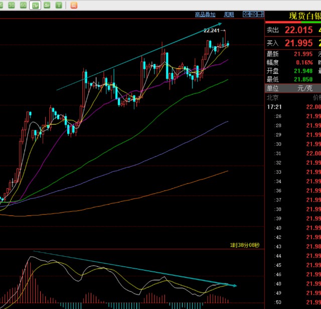 第二,白银方面:昨日21.2支撑看涨略差0.1左右,阻力再次试探了22一线;
