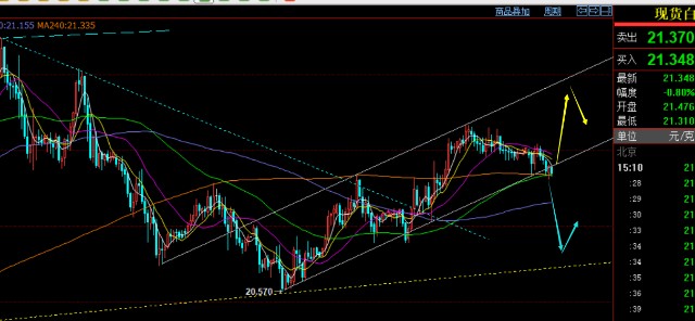 白银方面:周三收报一根大阳,周四小阴作为一定修正,今日周五比较关键,若收阳回去,则周四高点还会突破;反之,收阴回去,又失守短期5均线收盘于下方,则周四高点可能就是次高点;从短期运行通道看,当前处于一定上行通道内发展,此时正测试下轨位置能否有效再次支撑,也就是21.3一线;若守住再震荡拉升一波,或指向测试21.9-22;反之,守不住破位下去,上行通道或转为下行通道进行承压,测试20.9;