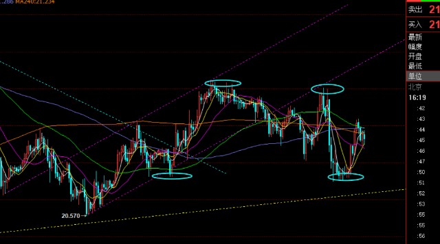 第二,白银方面:21.6一线处于4小时布林带上轨,且通道是缩口走平,压制存在,20.85是前期启动点,价格运行于区间内反复震荡;