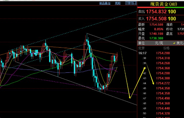 第三,黄金小时线级别:隔夜一路连跌下滑,未收任何阳K线,短期打压力度算大的,作为今日正常的做法就是依托顶底阻力1746一线或382分割阻力去弱势跟空一次,但此位置仅仅只承压1个小时,且回踩只给到1743,随后连阳上冲试探了618分割阻力1753-54,促使走势从隔夜的弱势又转为震荡;当前留意年均线压制1754-55,其次是通道上轨1758一线,也是809分割阻力,支撑1746-45、1740-38,震荡反复行情,延续性较差,只能继续高抛低吸,卡阻力和支撑之间;