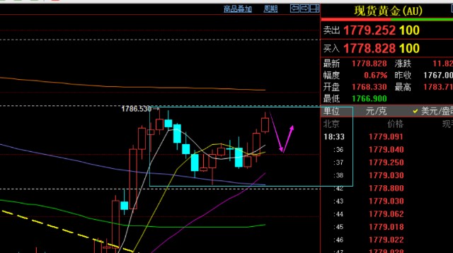 第一,黄金方面:昨日亚盘循环上行,欧盘突破1755阻力延续一波反弹,而1767下存在通道压制和前期开跌口阻力共振,因此美盘前后给出1767-1755区间内对待,接下来出炉的小非农利多,和GDP利空,也促使金价在此区间走了小范围的上蹿下跳;后半夜鲍威尔的一番鸽派言论,刺激黄金从1745低位急速拉升,今日最高试探了1783.5一线;