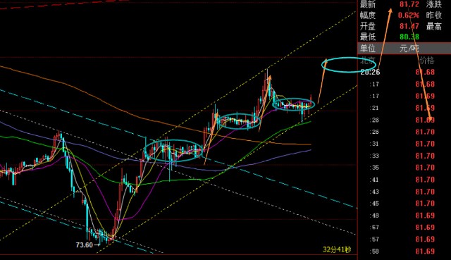 原油方面:循环推演模式还在,上行通道还在,日内这几天都是箱体小洗盘横盘,晚间就是一根筋拉升破高;关注81一线支撑,守住继续震荡看涨,阻力82.5、83.3、85三处;