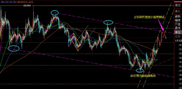 白银方面: 22.4前高也被突破,那么多头也会进一步上冲,“N”字型拉升展开,按照通道指引,可以指向25一线,在紫色箭头处,方可再次出现下跌调整;因此,价格只要处于22.4上方运行,也是强势推动;