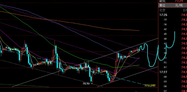 今日来看,从分割角度,82.7-70.1,可以知道74.9一线存在382分割压制点;同时结合小时线通道,也可以看出74上方正在不停的测试上轨压制点;macd多头也有所衰减,不过小时线10均线未有效失守前,仍处于一定逼空状态,需耐心等待信号,关注74.9及上方承压形态;支撑留意小时线中轨和66日支撑72.2,触及看企稳延续反弹修正即可,站上74.9,下一个分割压力是76.4,刚好也是小时线年均线,这应该需要一定震荡时间才能给到;总体上,短期看反弹修正为主,遇关键压力位看承压,直到几日后顶背离严重后再看拐点抛售;