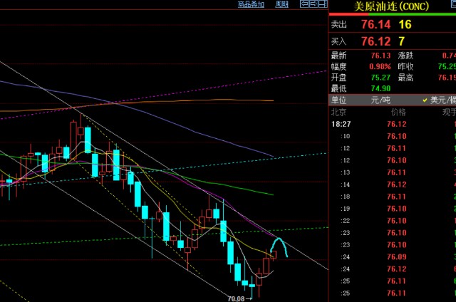 原油方面: 本周判断黄金拐点向上破位成功,同样判断原油拐点反弹拉升成功,在70上方低位分析得出,油价由于严重底背离,随时存在一波上涨修正,当晚间22点后并未循环打压,而是继续拉高上行时,就断定原油结束弱势下跌,转为反弹上行,这几日短线多次提出回踩继续看涨,昨日成功试探阻力74.9和76.4;
