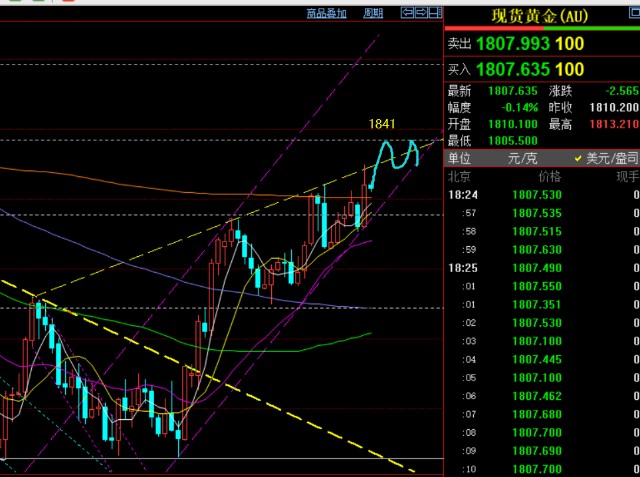 黄金思路上:1805、1801两支撑先关注下,短线仍维持看涨节奏,阻力1815、1824、1841;