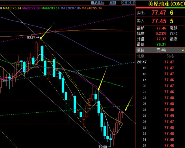 原油方面:针对原油,昨日思路继续看反弹上涨,日内也是符合一路上行,毕竟78下关键阻力;今日很关键,因为价格触及了日线中轨和下跌通道上轨阻力,重合一处77.7一线,若突破继续站上拉升,则底部70以来的反弹会得到延续扩大;反之,压制77.7今日出阴,则会暂缓反弹,甚至拐点转跌,最终需要看明日的形态来确认; 当前就关注77.7下承压,短线支撑76.3和75.7;