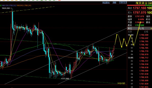 第三,黄金小时线级别:早盘依托隔夜低点多次不下而企稳,午后一波急拉至1796,是受到日本央行介入避险刺激;冲高回落之后依然支撑了通道下轨位置,当前又展开连阳上攻,关键的则是上轨1795关注它的有效突破,一旦成功,拉升至1800上方问题不大;此时有所突破,建议保持继续看涨为主,阻力留意1804、1808、1813、1818四处位置;