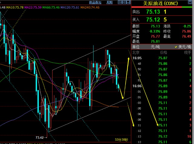 原油方面:日线承压下降通道上轨,也就是中轨,只要此位置不上破,维持短期打压下行;参考小时线走势通道,可清晰看到它的运行轨迹,上轨触及压制,下轨触及支撑,这也是很好把握的重要技术手法;由于日线倾向于跌,因此拉高看压制为主;76上方都有压力区,下轨位置74.7-74.8,只有破位下轨有效,才能结束缓慢上行通道,转弱下行;不然,就继续参考通道内来回整理;