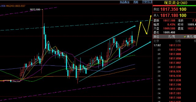 第一,黄金方面:昨日震荡一路上涨,依托1800支撑突破站上1810-09关键阻力后,成为顶底支撑进一步的推动上行,抵达1820一线短期一个目标位;整体上,符合日线魔咒循环慢上行发展;盘中安排的1805多和1808加仓多,都是依托小时线中轨支撑布局;