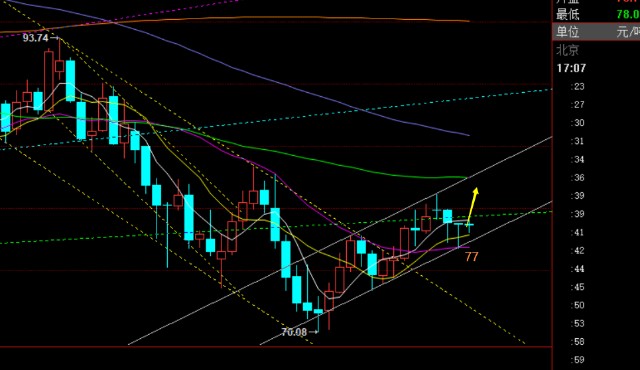 从小时线级别看,早盘支撑中轨78.1进行反弹,但价格多次承压79,始终在反复测试通道反压一线,只有突破站上79强拉上行,才能进一步的推动去试探前高81;因此,当前的运行区间是关注78-79之间,看上下得失破位情况,78往下还有77.5,
