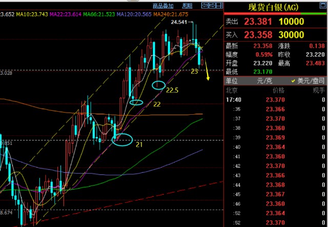第二,白银方面:本周二价格触及24.55一线高位,提示可以收割近一个月以来的多单,从22一线开始提示震荡看涨;只是可惜并未反手空,计划想着是25一线去反手,结果两三天时间就直接跌至23.1,23.5-23.6则成为顶底阻力承压下行;