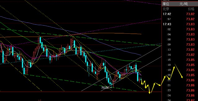 原油方面:昨日算是扳回一城,提示75下看跌下行,最高刚好75附近,最低抵达72.5;也提示过,一旦破位隔夜低点容易背离反弹,因此破位后不宜盲目再看跌,而是等待反抽一波再继续看压制; 小时线连阴破底后,反抽618阻力74一线再次看压制,不过价格走了一个V震荡,所幸74.95未突破,今日依托74.6下继续看跌,成功跌了一波至73.3,则全身而退拿下; 接下来,阻力继续留意74.6下,价格底部区间可能会反复性强,要时刻见好就收,支撑72.2-72;按最新通道指引,就是关注74.6-72之间的偏弱运行整理;若意外突破隔夜高点,则往上阻力关注76-76.4承压,这里是日线中轨处,也是近期高低点产生的分割阻力点;
