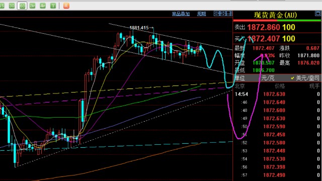 第三,黄金小时线级别:这个周期的走势还是相对有些磨人,可以发现它是处于一个小型下行通道,高点逐步下移,短期压力逐步下滑压制,但似乎还有些挺抗跌,反复的试探通道上轨,此时不管是看涨还是看跌,心中难免都有些担忧,不过只要严格风控,耐心等市场反应出结果即可;按通道来讲,1876-75是当前短期阻力,1865-64是下轨短期支撑,还是10美金之间做争夺,往上还有1880关键阻力的得失,往下有1858-56关键支撑的得失,那么小区间或者大区间就可以看出,震荡对待;
