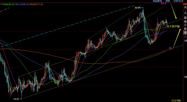 原油方面:本周这几日它就难把握了,日线大阴大阳来回切换,每天一个样,方向容易改变,重要的是波动率过大;当隔夜持续大跌后,第二天就容易持续慢涨,反之一样;因此,原油还需多观望,耐心等较好的高低点,比如83.4下,比如78上,这两处都属于上下通道反压和回踩点,和日线的半年线以及中轨均线也有共振; 而其他中间位置就需要临盘观察,一旦上下反复起来,就容易被震出;当下留意中轨位置得失情况来寻找机会;