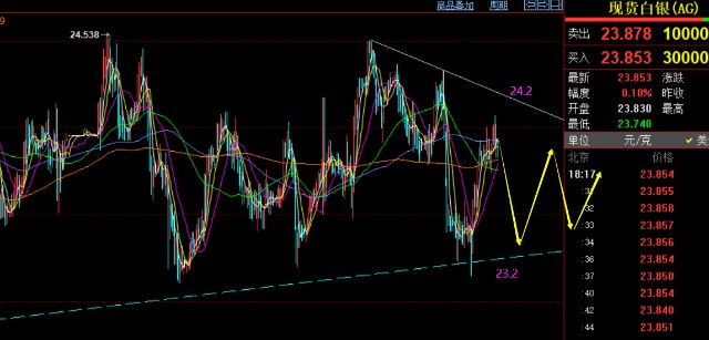 第二,白银方面:它跌起来比黄金快,反弹起来比黄金慢,这是白银近期的特点,昨日早盘先跌至23.2低位,只要23.1-23未破位前,就还是日线区间内震荡,则提示23.2逢低先看反弹一波;到了今日就该反手,继续看压制下滑了;