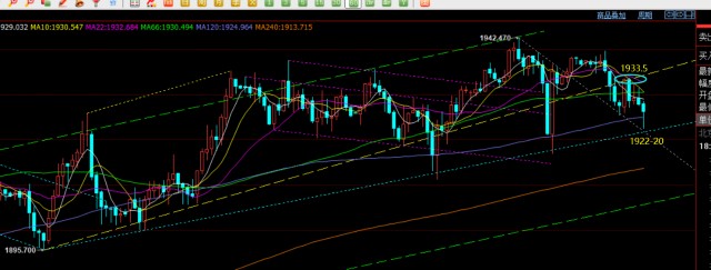 第三,黄金小时线级别:隔夜拉升,今日早盘续涨不成功,这是作为震荡行情中大概率要发生的事情,因此当出现倒锤头阴K线明显承压形态后,就应该要去尝试看跌,而亚盘一波下跌,午后反抽仍多次承压中轨或通道反压1933.5一线,则欧盘进一步看回测下行,最低给到1922,算是逼近试探了1920关键节点位置;那么晚间就是针对1920一线的争夺,风水岭阻力则是欧盘高点1933.5,若突破它,则继续来回过山荡;反之,仍压制它不上,再失守1920有效 破位下去,则打开进一步下跌空间,指向1910-07及下方;