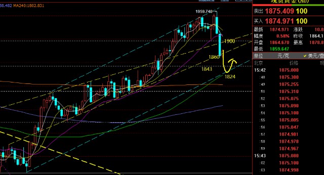 第一,黄金周线级别:上周收一根倒锤头大阴吞没形态,这种承压力度是相对较大的,1960一线高位可以成为短期的顶部,而本周的首要关键支撑点正是10均线1860一线,往下是通道回踩点1850一线,1860-50可以说是中期黄金逼空多头的最后防守,一旦继续失守,中期方向也会结束前期的逼空拉升,转回调修正,届时可能会逐步试探中轨(目前支撑是1770);阻力则留意5均线1900一线;