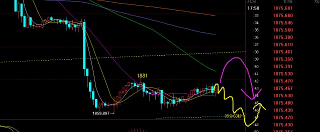 第三,黄金小时线级别:隔夜处于1771下弱势整理,今日亚盘又是循环直接震荡慢上涨一波,那么接下来就要看欧盘的压制效果;由于15分钟周期又出现了一定顶背离状态,参考昨日欧盘压制时间点,大概率当下也应该快承压了;因此,先以日线提出的第一种走势思路对待,昨日1881高点未突破前,低位弱势压制对待;支撑是中轨1870,再度破位下去,就可以指向4小时线年均线1865一线,以及重点是1860位置的得失;由于macd处于缓慢上行放量,一旦破位1860前日低点,则会产生底背离而容易探底拉升,因此1860下方需谨慎看跌的;
