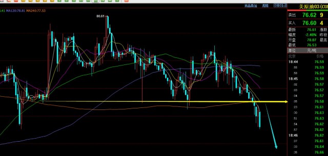 原油方面:昨日围绕77.65-79.5区间内整理思路正确,而盘中多次给出看跌计划,虽来回震荡反复比较磨人,但最终还是成功下行;今日比较可惜,早盘分析出78.5看跌,欧盘77.6看跌,价格都差二三十点而踏空;当前来看,今晚不要期待过大的反抽,日线10均线基本有效破位,有望大阴指向74一线通道下轨点;而小时线10均线是今晚不错的压制点,基本也是欧盘前后的开跌口77.35一线,以中轨作为防守,今晚77.35下继续看跌为主,这几日交割期,油价按往年走法都容易迎来抛售;03合约报价;
