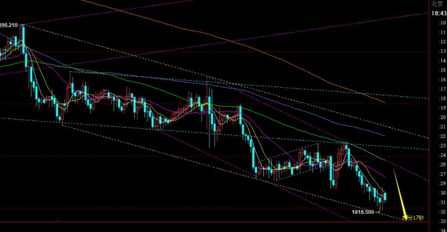 第三,黄金小时线级别:隔夜压制1845,且顶部出现受压形态,原本计划反抽通道反压(下移1842)再继续看跌,但无奈价格直接走了连跌,丝毫不给反抽机会; 根据通道下轨指引,首要支撑在1817-18一线,因此这里出现了一定反弹迹象,而能否有所扩大修正,要看是否能站上10均线,那样才有机会触碰中轨1831-32和66日均线1838-37,也是继续顺势看跌的两个参考点;然后结合黄金分割一画,和50、618分割位置基本靠近,形成了一定共振;一旦承压10日或66日,还会反复试探日内低点,然后二次下不去,下周一就会发生类似昨晚的走法,日线也就继续阴阳循环,这是一环扣一环的市场布局;