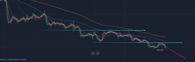 第三,黄金小时线级别:隔夜探底拉升一波,作为震荡行情,最希望看到的是早盘先小幅反弹续涨,那样容易不延续而回落一波,时间节点一般关注10点前后,因此1819高点如期承压下行;当失守10均线有效后,反抽确认此线又是一次看跌机会,美盘前基本可以把握这两次时机;当下应该要窄幅整理下,风水岭阻力下移1817一线,支撑1805-06,短期阻力关注5日,极限10日,要震荡延续下滑,是不会再突破站上10均线的,那样一旦发生就会导致反复的上下串;所以,1812、1814是短期阻力点,继续维持承压看跌为主,再去破新低的话,就应该可以试探1800关口了;而刷新低后,可能又会出现反复的背离反弹,相对好的博反弹位置还是会耐心等1788或 1788-1775区域,预计也是一定拐点会出现;