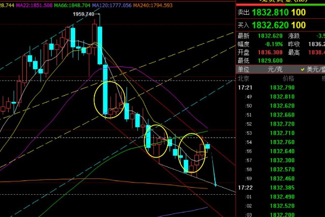 第一,黄金方面:昨日早盘并未按一般震荡规律就行,直接续涨成功一波,突破1834前面的某一个开跌口,一路冲击晚间最高1844一线,力度比预期偏大,但日线级别仍坚守看空思路不变;因为一波下跌行情,反弹修正极限三个交易日,而昨日是第三日收阳,意味着今日容易杀多,回归弱势空头打压;原本预期是承压日线10均线直接掉头向下的,昨日收盘虽处于10日上,但留有上影线,且处于下跌通道内;文章也是给出1842节点下作为拐点坚守看跌,盘中多次给出做空计划,今日终于开始慢下行;