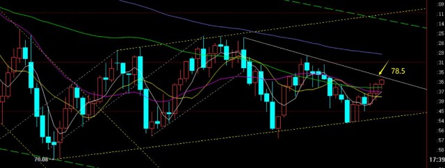 原油方面:昨日77.8-76.2之间反复过山车了好几次,文章指出77.8未突破站上前,先维持77.8下看压制回测,符合一定思路,几次下探百点空间;而今日此时突破了77.8,多次承压的位置被上破,就容易延续一波反弹,但由于短周期macd的背离,以及这几日的反复震荡格局,也不敢直接追涨,上方关注78.5,处于82.4-80.6前高的趋势阻力点,支撑77.8、77.2、76.6,先继续围绕区间做震荡;若价格突破站上78.5,那么扩大反弹上行空间就被打开了,日线收敛三角整理选择上破,届时需回踩看涨一波;