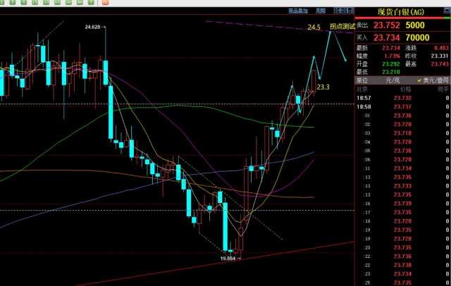 第二,白银方面:它的走势就较为明确,好下手,日内只要打出一个低点,就基本很难破位它,也就是不会洗盘,昨日提出23作为支撑点,其上逢低继续看涨,运行一日也无法再跌破23,最终抵达23.6目标;