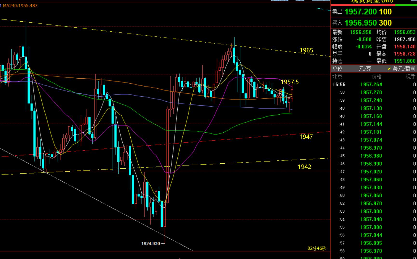 第四,黄金小时线级别:隔夜冲高回落,凌晨承压1960阻力,今日运行至当下,波幅很小,仍承压1960下,支撑1950上;要留意中轨处1957.5,若突破站上,可能还有些反弹空间,上方趋势阻力1965下仍看压制;反之,若中轨无法站上,则此它作为承压,将压制下滑破新低;下方趋势通道支撑有两处:1847一线和1942一线,是回调下行的两个支撑目标点;而1940若再下去的话,就要时刻关注企稳信号;