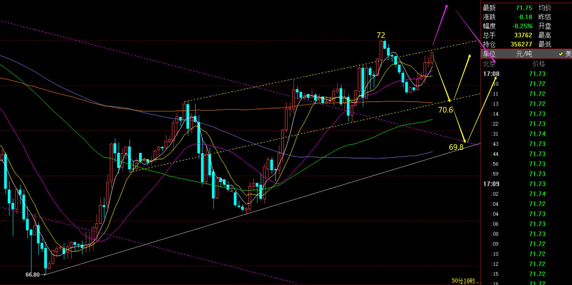 原油方面:周线和日线仍处于宽幅震荡中,没有明确的趋势方向,短线随时日内容易反转震荡;隔夜承压72后,今日亚盘一路连阴回测支撑70.8,欧盘企稳有所反弹,只要不过隔夜高点,则还会回落下跌,进行反复运行;另外,不去高位直接看涨的原因还在于macd仍处于一定背离中,不敢跟涨,近期也容易涨跌随时互换整理,支撑70.6和69.8,以区间来对待,拉低回测后可以去看涨反弹;