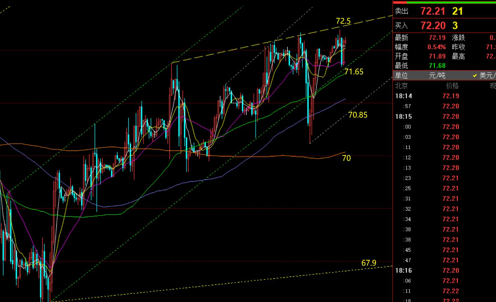 第三,原油方面:昨日计划依托短期通道下轨支撑71继续看涨反弹,但美盘出现一波跳水,失守了71,最低打到70.26,还好守住了70.2防守,反弹确认通道反压点71.1就提前调仓出,毕竟入场位置不好了,不过半夜又V回去,抵达了原本预期72及上目标;