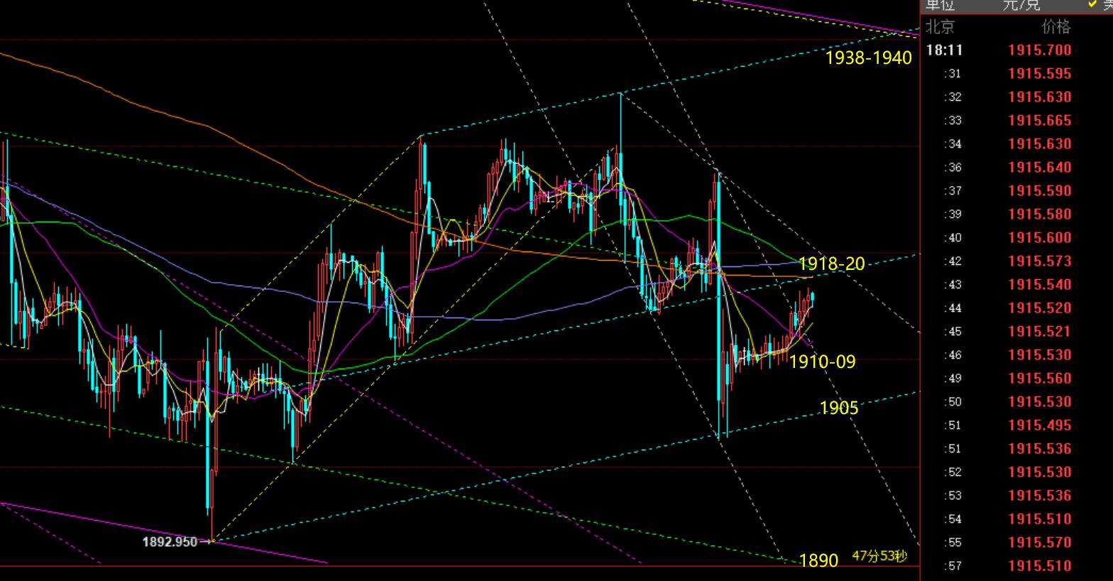 第二,黄金小时线级别:隔夜一波下跌走弱,今日震荡一路反弹,按规律来讲,欧盘不跌,美盘也要等承压看跌一次,然后下跌仍不破隔夜低点,再进行反弹震荡;从图中通道可指引,阻力1918和1920两处,数据公布前应该难以突破它们,支撑1910-09今日早盘低点,等待非农来打破这个小区间;若数据利多,往上急拉按至少20美金算,可以快速先指向1935,刚好对应通道反压1940下;若数据利空,往下急跌先关注1905,再守不住就可能1900也挡不住,跌至1892-90,也差不多20美金来计算; 当然,还有一种情况,就非爆表,也非爆冷,数据处于预期和前值之间,那样波动的范围基本就小了,来回扫的节奏;就现在来讲,阻力1918-20,过不去就还会打压偏弱,而过去了,就会加强拉升反弹;