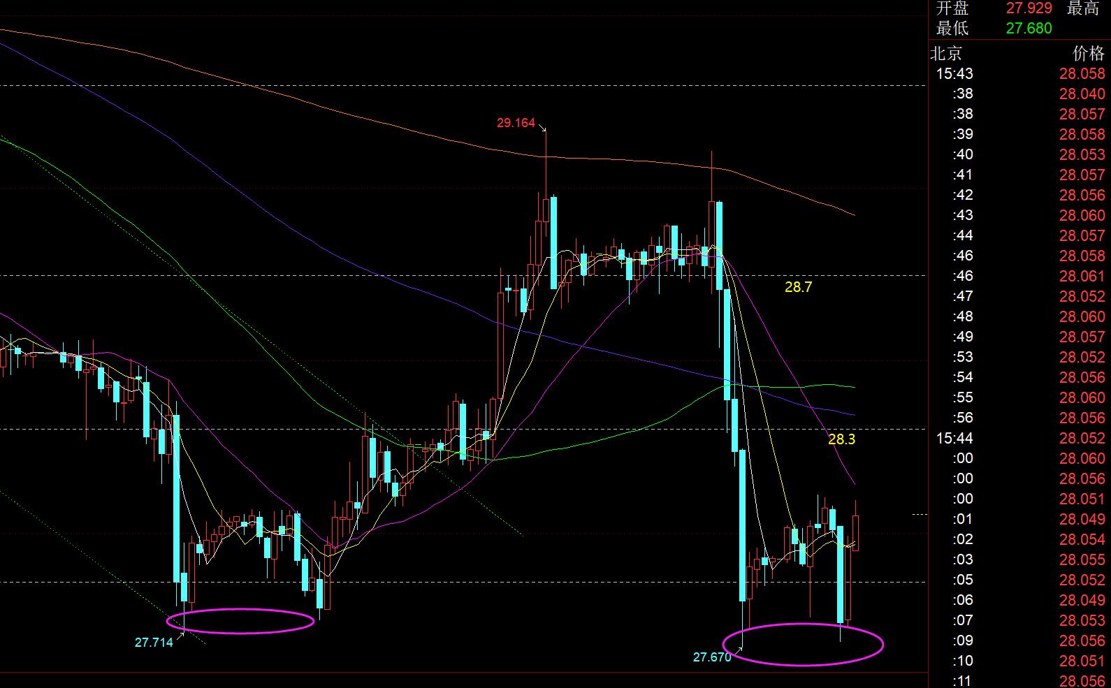 第二,白银方面:研报指出,公布之前处于高位整理,28.6是风水岭,要看涨就直接先上攻,的确符合一波拉高至29.1,之后也是冲高回落,打回大区间内震荡,回到27.7起涨点;
