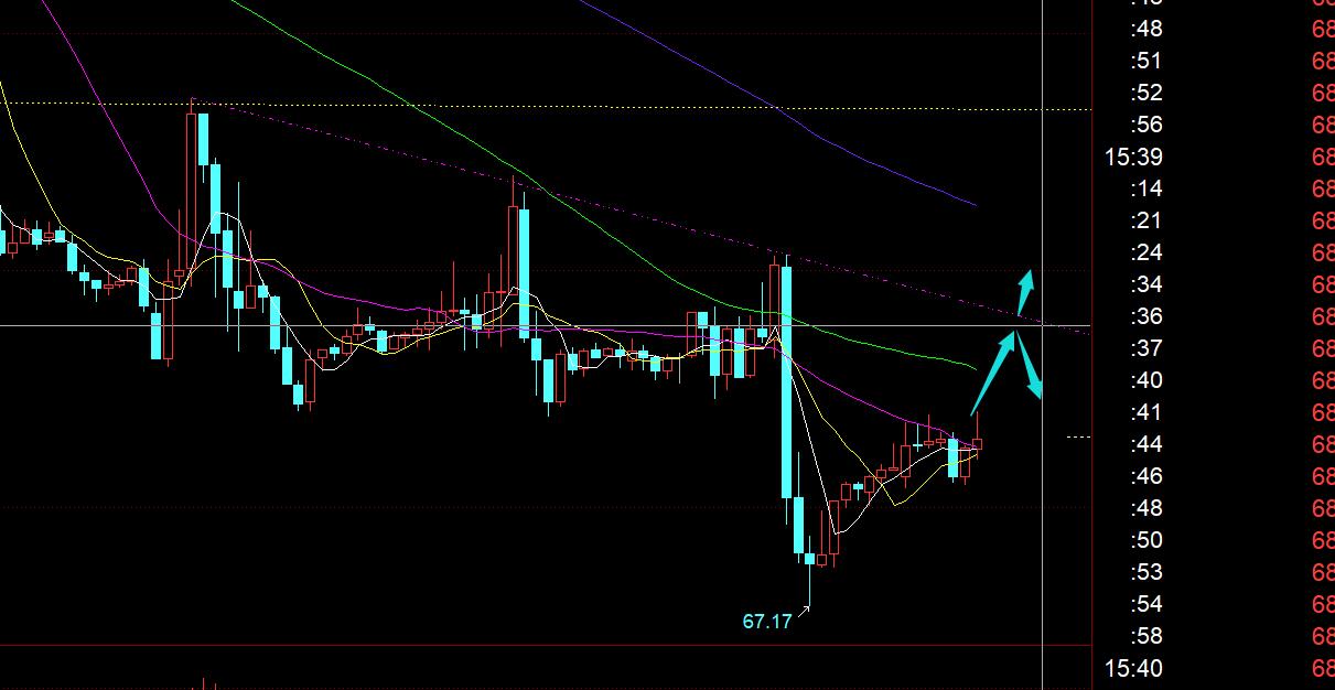 原油方面:日线5均线下移69.1,上周多次反弹上攻承压此均线下滑走弱,结合上图,趋势阻力69.5-69.6,触及出压制信号,可考虑跟随看跌;同时也要做好心理准备,因为短周期macd处于严重底背离状态,随时可能出现再次超跌反弹修正;一旦越过趋势阻力点,或者日线收盘站上5均线,就要谨慎看跌;